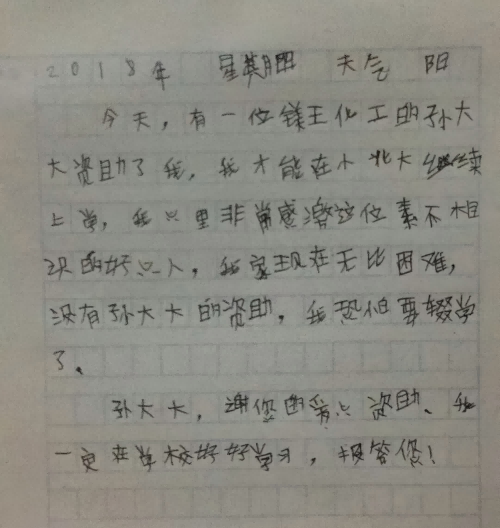 當(dāng)年8月份,紀(jì)某某和賈某某兩位學(xué)生分別以優(yōu)異的成績(jī)考入石家莊鐵道學(xué)院和河北工程技術(shù)學(xué)院。因家庭收入過(guò)低,無(wú)法支付昂貴的學(xué)費(fèi),家人一籌莫展,得知情況后,孫文董事長(zhǎng)慷慨解囊,分別給予紀(jì)某某10000元、賈某某6000元的資助。受助家長(zhǎng)激動(dòng)地說(shuō),真不知道怎么感謝董事長(zhǎng)的恩情,兩位學(xué)生表示,一定不辜負(fù)孫文董事長(zhǎng)的愛(ài)心和厚望,努力學(xué)習(xí),用優(yōu)異的成績(jī)回報(bào)社會(huì)。