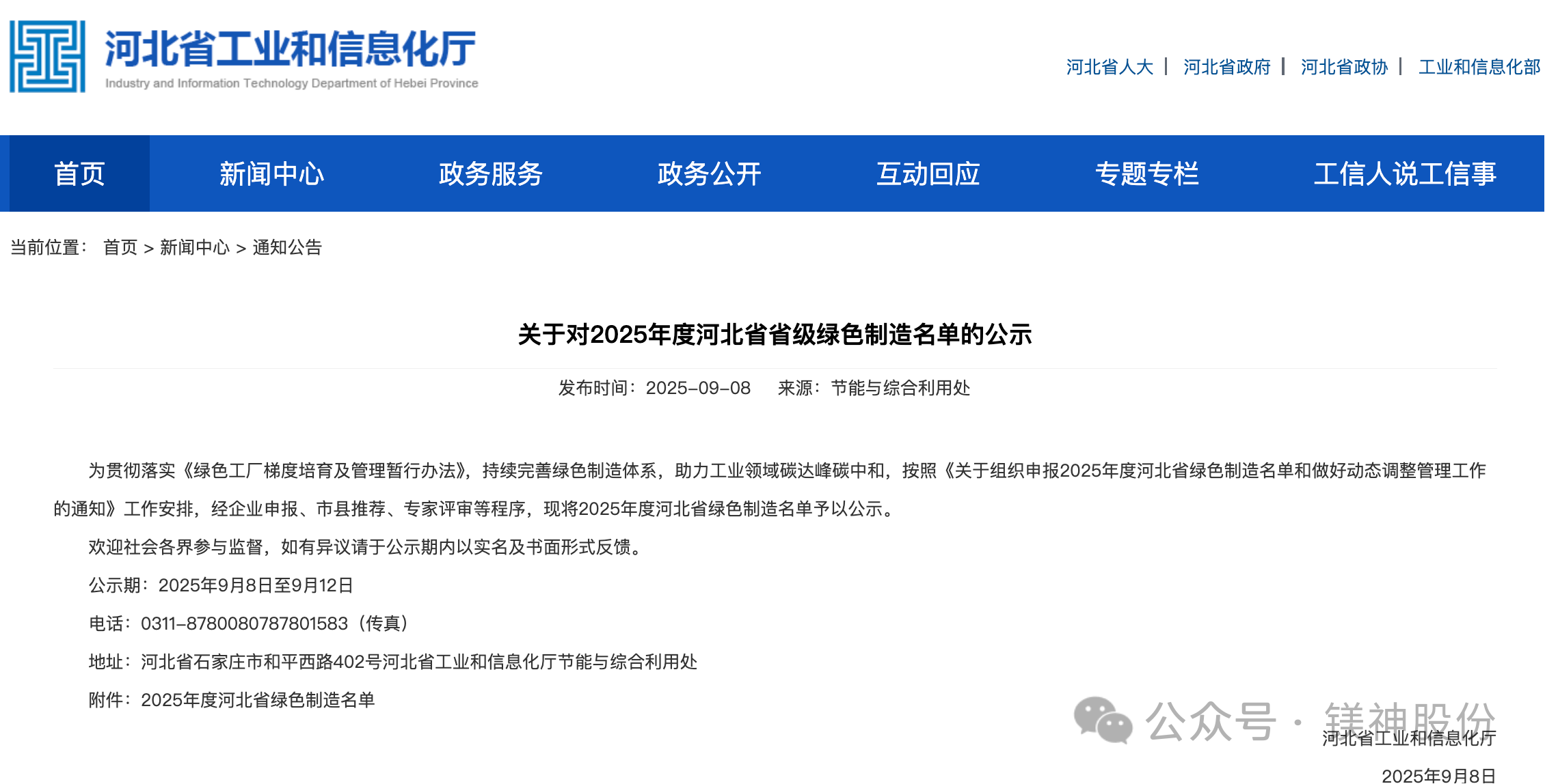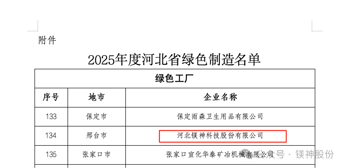 2025年9月8日,河北省工業(yè)和信息化廳正式公布了2025年河北省綠色制造名單。河北鎂神科技股份有限公司(以下簡稱“鎂神科技”)憑借在綠色制造、節(jié)能降耗、清潔生產(chǎn)等方面的突出表現(xiàn),成功入選“2025年度河北省綠色制造名單”!這是公司積極踐行綠色發(fā)展理念、扎實推進(jìn)綠色體系建設(shè)取得的重大成果,也是對鎂神科技綠色制造水平和可持續(xù)發(fā)展能力的認(rèn)可!